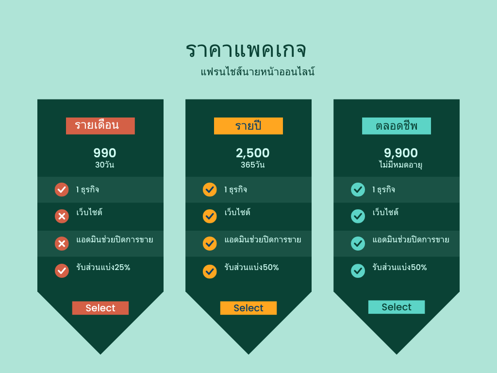 แฟรนไชส์เริ่มต้นที่ 990บาทแบบรายเดือน 2,500บาทแบบรายปี