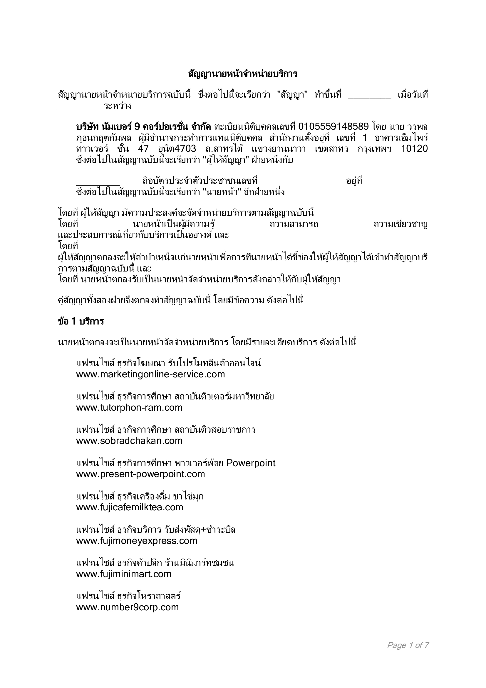 บริษัท นัมเบอร์ 9 คอร์ปอเรชั่น จำกัด ดำเนินธุรกิจแฟรนไชส์ บนเครือข่ายอินเตอร์เน็ต เปิดรับแฟรนไชส์นายหน้าออนไลน์ โดยที่คุณมีหน้าที่แค่โปรโมทและประสานงานเท่านั้น รับส่วนแบ่งสูงถึง50%